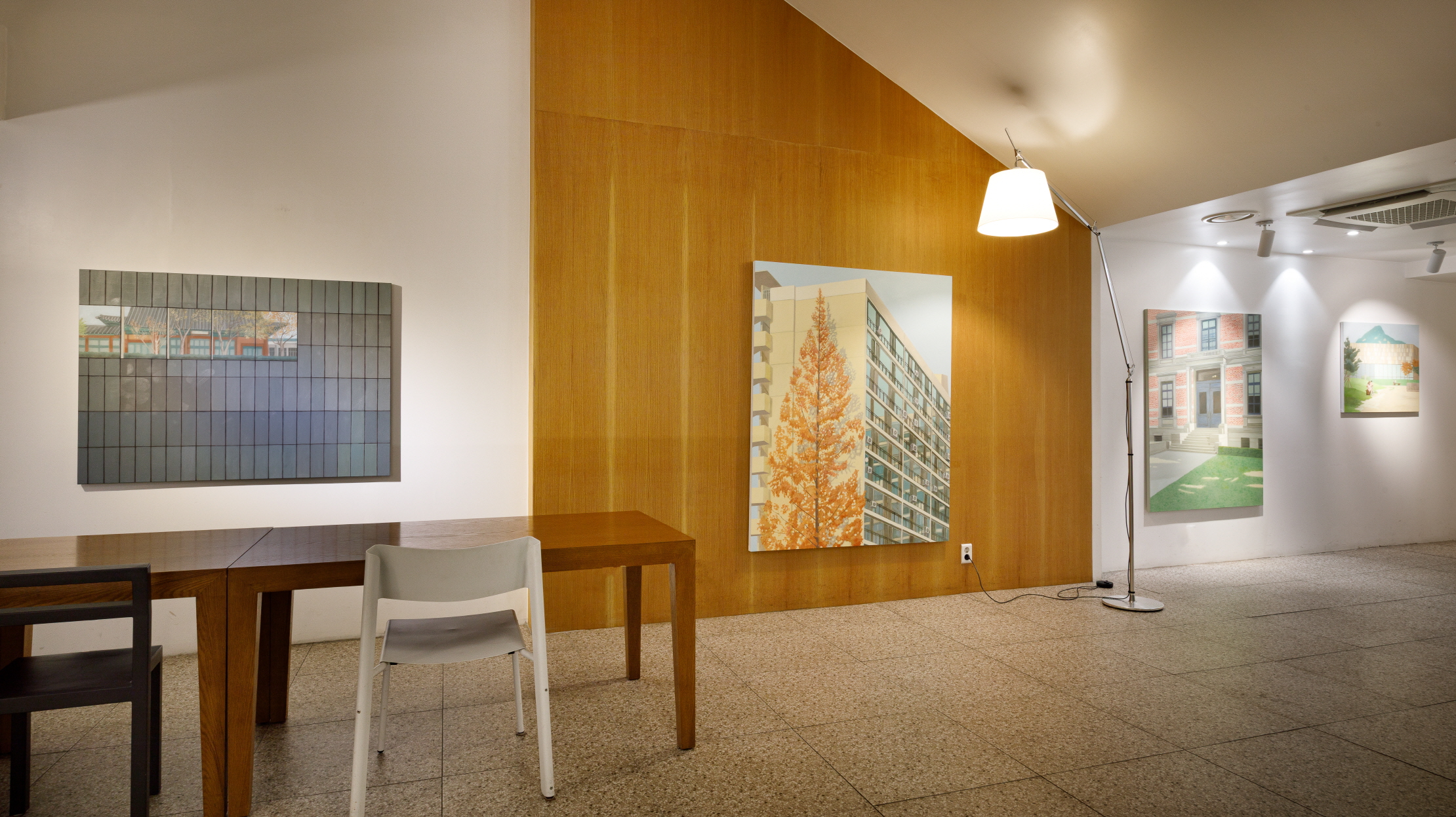Installation view from In the Midst of Life, a solo exhibition by Jieun Lee held at Space Huam 23, a historic cultural space repurposed from a former auxiliary building of the Railway Bureau during Korea’s colonial period. The exhibition presents scenes drawn from Seoul’s modern architecture, familiar figures living through everyday moments, and dream-like landscapes, weaving together personal memory and collective urban history.